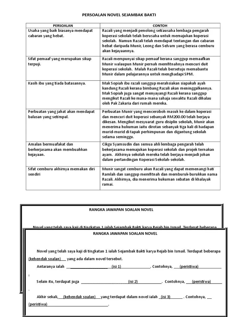 Perkongsian soalan, nota, latihan, skema jawapan, bahan rujukan dan informasi . Tema dan persoalan novel sejambak bakti. Novel yang telah saya kaji dalam ialah novel sejambak bakti karya rejab f.i.