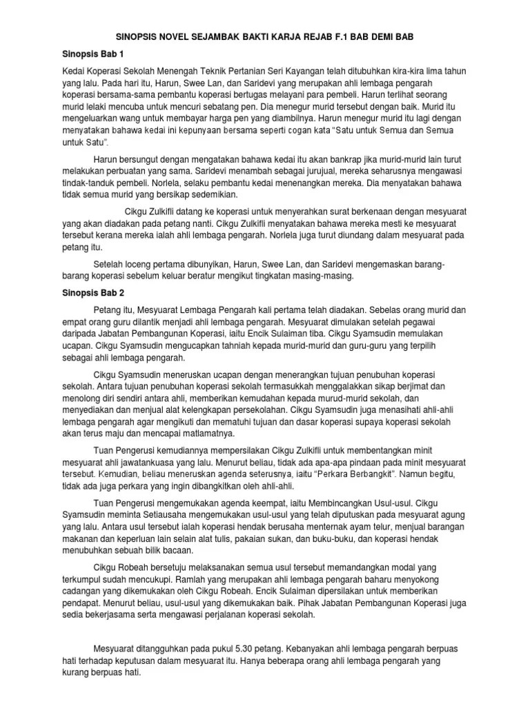 Persoalan Novel Sejambak Bakti : Plot Novel Sejambak Bakti Tingkatan 1. Tema dan persoalan novel sejambak bakti. Sinopsis, watak dan perwatakan, tema, persoalan, nilai, pengajaran, latar masa, latar tempat : Novel yang telah saya kaji dalam ialah novel sejambak bakti karya rejab f.i. Tema dan persoalan novel sejambak bakti. Novel yang telah saya kaji dalam ialah novel sejambak bakti karya rejab f.i. Tema novel ini ialah kegigihan sekumpulan remaja memajukan kedai koperasi sekolah.
